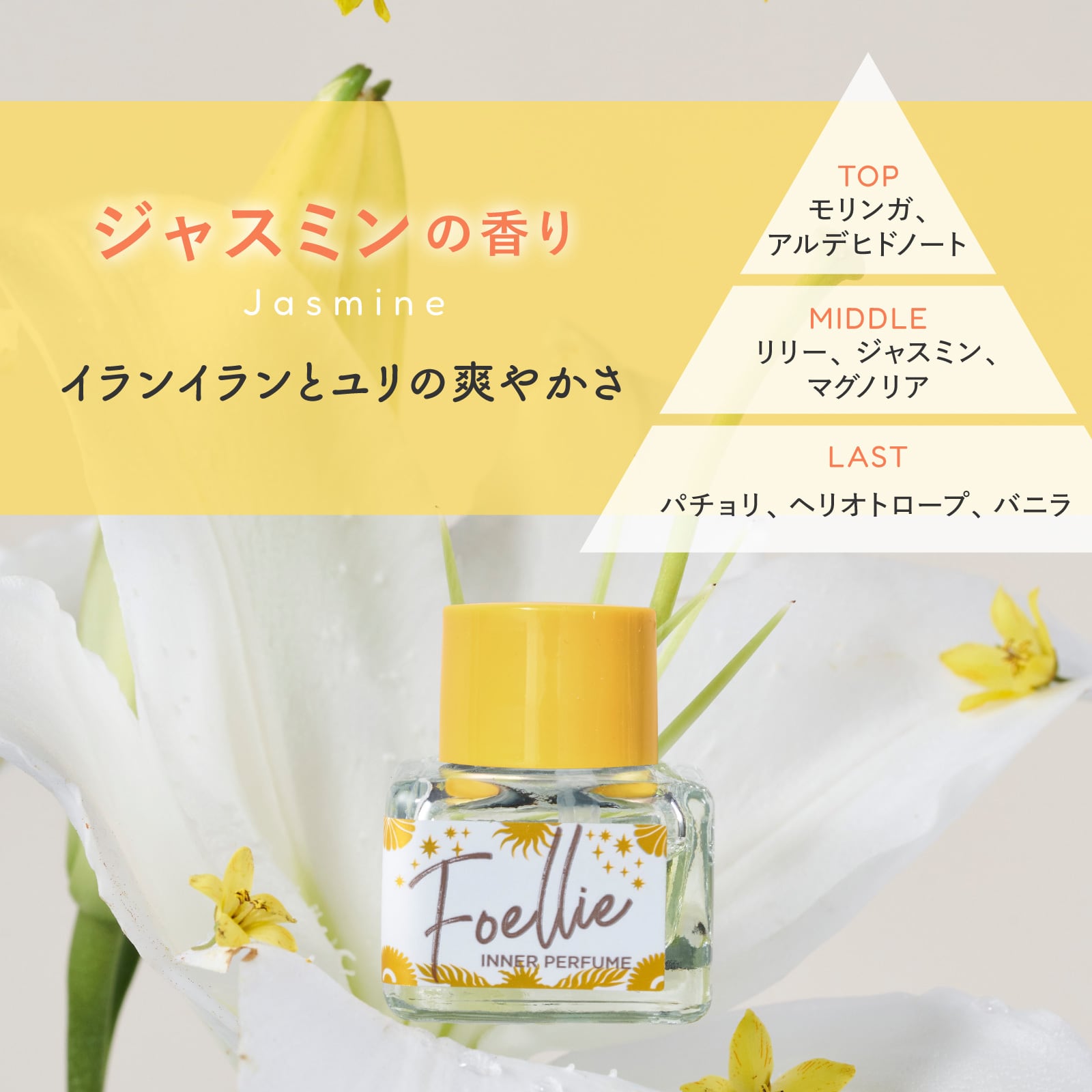 デート前、気分を上げたい時に、もちろん普段使いの香水としての使用も可能です。お肌に優しい6種類の植物オイル 【月見草油、ヒマワリ種子油、ユチャ種子油、マカデミア種子油、ホホバ種子油、アルガンオイル (アルガニアスピノザ核油)】配合。アルコールフリー。シトラスフルール、チェリーブロッサム、ホワイトフローラル、ジャスミンの4種類。たった1~2滴でほのかに長く香りが続きます。フォエリーであなたの日常を明るく前向きに。